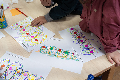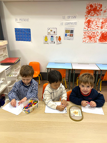 ▲フランスの幼稚園、子どもたちが課題をやるときに使うのも必ずペンか色鉛筆。 ちなみに普通の鉛筆も使いません。 (フランスでは小学校で文字を書く時も鉛筆ではないからだと思われます。)