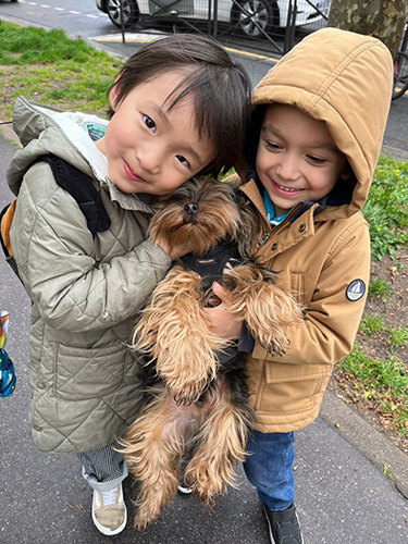 ▲幼稚園のお迎えに行くと、ボクは大人気。 いつも子どもたちにモミクシャにされるよ‥‥。もう慣れたけどね‥‥。
