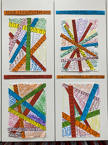 教室や廊下に貼ってある作品、 そして学期ごとに持って帰ってくる 作品ファイルもみてみると 全て色鉛筆かペンで作業されています。