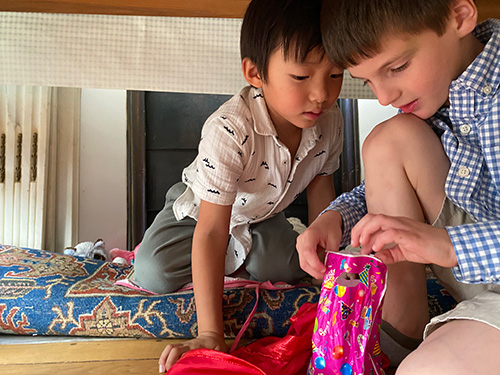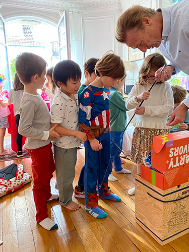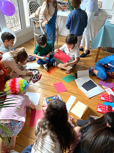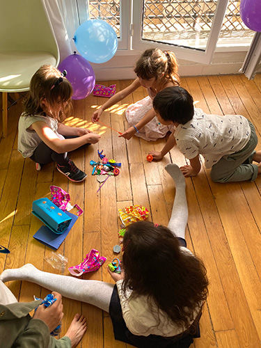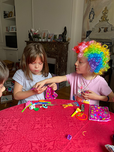 フランスの誕生日パーティー恒例の、 来てくれたお客さんたちに配られる 小さなプレゼント。 たいていは小さなおもちゃやお菓子の 詰め合わせだったりするのですが、 そのおもちゃたちを広げて、 何が入っていたとかいないとか、 これと誰か交換してくれとか嫌だとか。