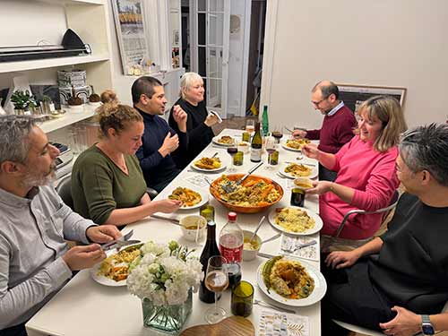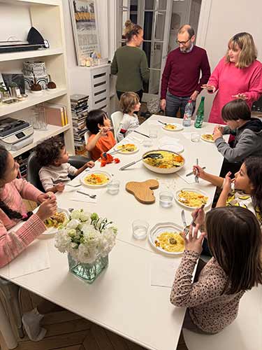 フランス人はもちろん、わたし日本人をはじめ、 イタリア人、モロッコ人、スペイン人etc. 国際色も豊かだったりするので、 みんなが食べたい料理やお菓子を教えつつ、習いつつ、 一緒に作ったものをランチやディナーで食べるという とても楽しくて美味しい会をやっています。