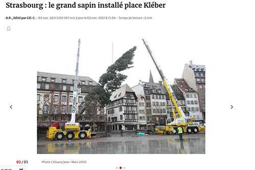 選ばれた木が10月末に切られ、 ストラスブールに運ばれて11月2日に設置。 運ばれてきたばかりの木は 最終的な出来上がりからは 想像もつかない見た目なのですが、 広場に設置された後に数週間かけて バランスを見ながら枝などが追加され、 飾りが追加され、クリスマスの時期に 私たちを楽しませてくれる姿になるそうです。