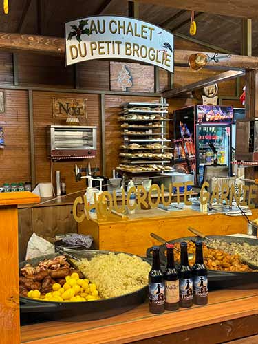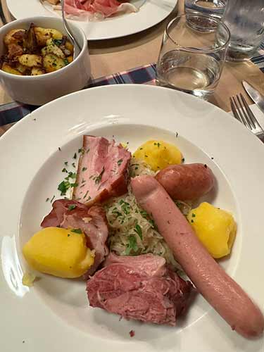 ▲アルザス地方の代表的な食べ物のひとつ「シュークルート」。 クリスマスマーケットの屋台にもレストランにもどこでもシュークルートの文字が。