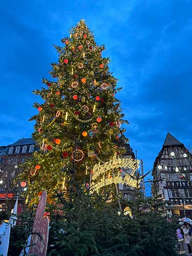 この時期のストラスブールの街のシンボルは クレベール広場に建てられる毎年恒例の 巨大クリスマスツリー。 高さが30mもあるツリー。