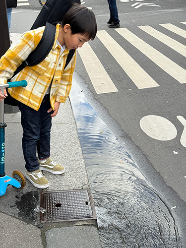 パリの道にはあちこちに 掃除用に使われる水栓があって、 そこから勢いよく水を流すんだよ。