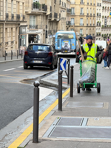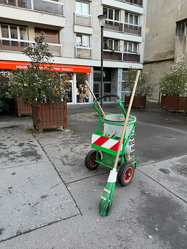 ▲掃除係のムッシューは、移動ゴミ箱とほうきを持って移動しながら大きなゴミはこの中に、 そして小さなゴミ類は全部水が流れる道路の方へと掃いていきます。
