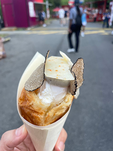 ▲「ナイフアンドフォーク」という名前のパスが配られて、 それを持っていれば、おいしそうなこんなフードバーの食べ物なども全て無料なのだそう。
