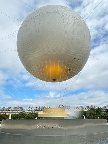 ▲チュイルリー公園に設置されていた気球型の聖火台。 聖火台の前で嬉しそうに記念撮影している警察官たちは、 海外から派遣されてきた治安部隊でした♪