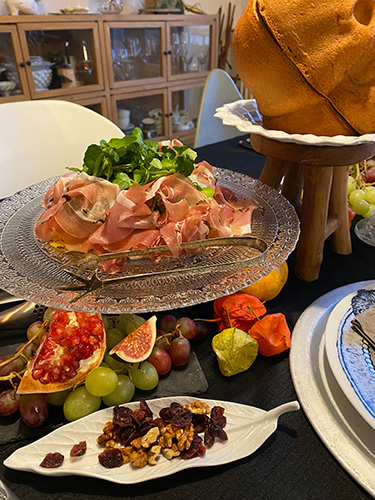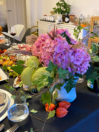 ▲秋色いっぱいのパーティーのテーブルコーディネートにも オレンジ色のほおずきが。 これはいつ行ってもセンス抜群の友人の家で‥‥。