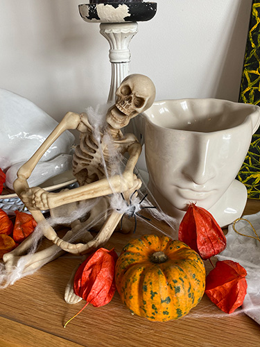 ▲ガイコツ好きな友人の家のインテリア。 いつも9月新年度が始まってから花屋にオレンジ色に色づいたほおずきが並ぶので、 私の中ではなんとなく秋のイメージがあるほおずき。 フランスでもよく見かける植物です。
