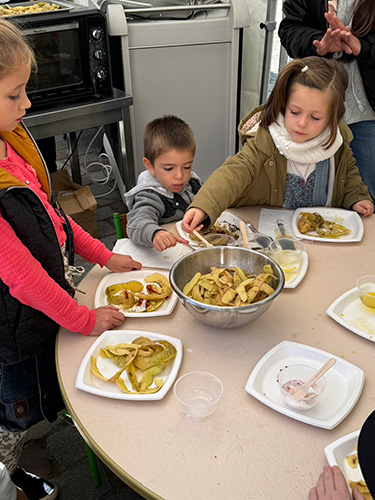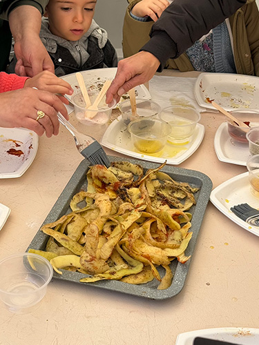 ▲子供たちが参加できるアトリエのコーナー。 こちらはジャガイモの剥いた皮を使って手作りチップスを作ると言うコーナー。