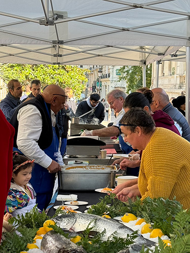 ▲こちらはメインの試食コーナー。 魚料理をいくつかお試しできます。 付け合わせの野菜のピュレやトマトのピュレも新鮮でとてもおいしかった!