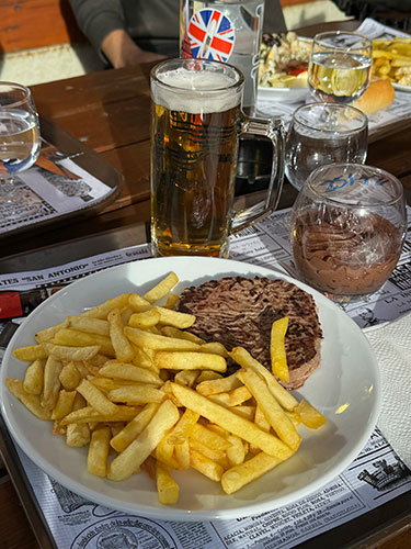 サラダもチョイスできるようになってたりするけど、 大人にも子どもにも人気があるのは やっぱりフライドポテトだよね。 「ステク・アシェ、フリット」 =「ハンバーグステーキ&フライドポテト」 っていうのが魔法の合言葉のように 連なって出てくる組み合わせなんだよ。