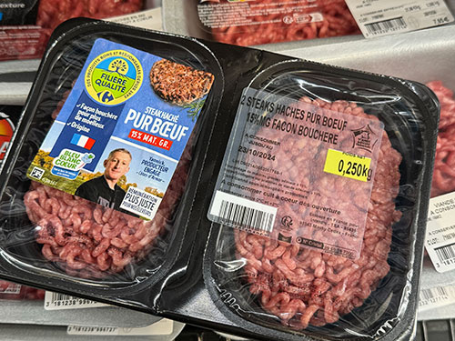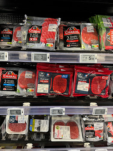 ▲こちらスーパーのお肉コーナー。 牛肉コーナーには必ず「ステク・アシェ」 (ハンバーグ型になってそのまま焼けばいいひき肉)がずらりと並んでます。