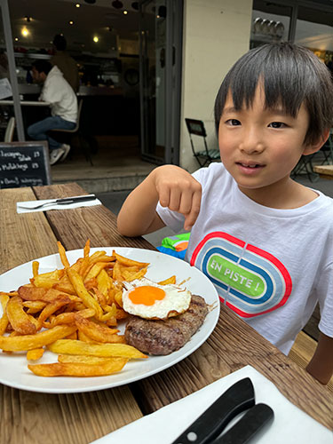 ▲どこのレストランに行ってもお子様メニューの定番は こちら「ステク・フリット」(=ハンバーグ&フライドポテト)。 「野菜がないじゃん‥‥」(汗)というのはフランスあるある。 もう慣れましたが、日本のお子様ランチの栄養も考えられたメニュー構成を見ると いつもびっくりします。