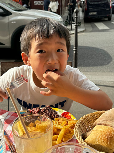 ▲子どもメニューの時だって、ちゃんと焼き加減を聞かれるステク・アシェ。 子どもには「ビアン・キュイ」(=ウェルダン)を頼むことが多いですが このくらい中が赤い状態で出てくることもしばしば。 そんなのももちろんへっちゃら。おいしくいただきます♪