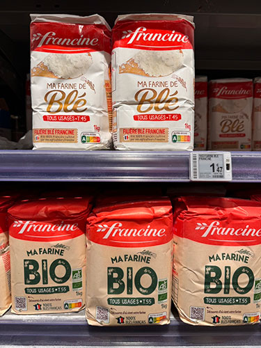 ▲「小麦持ち」になりたいフランス。小麦粉の種類はいっぱい。 上にはT45、下にはT55と書いてあります。 45から170までの数字によって「薄力粉」「強力粉」「全粒粉」などのタイプに分けられています。