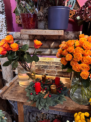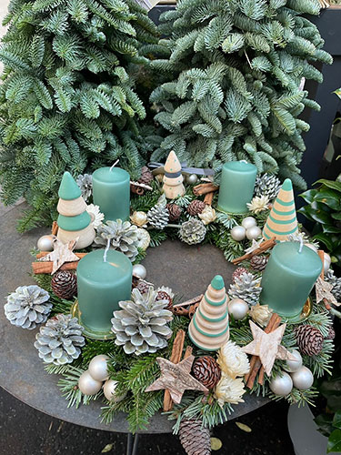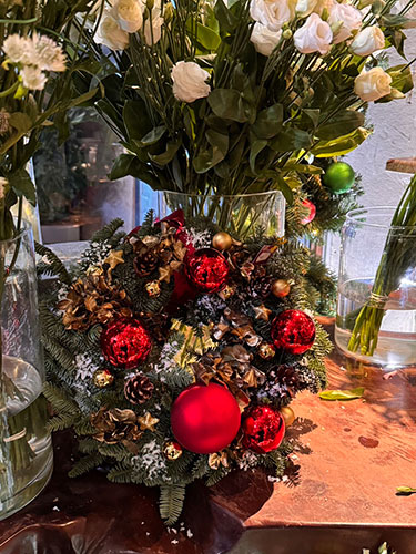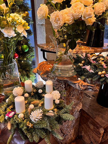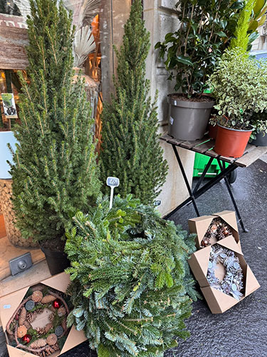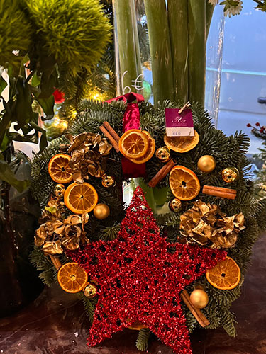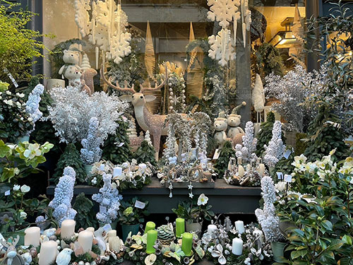 ▲こちらは近所の花屋さん。 店先には大量のもみの木が並んでいますが、店内に入ると、 伝統的なキャンドルリースもたくさん並んでいます。