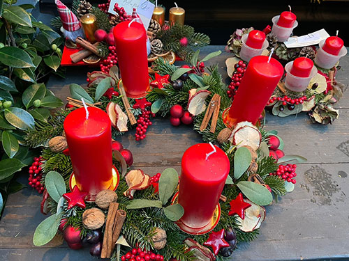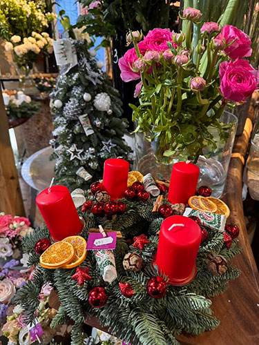 同じ時期に、そのお花屋さんをのぞいてみると、 キャンドルが4本立っている、 置くタイプのクリスマスリースが たくさん売られているのを見かけるよ。