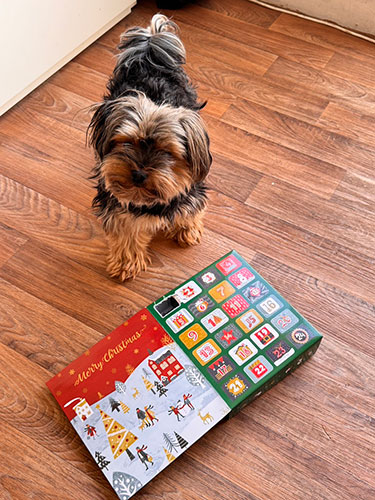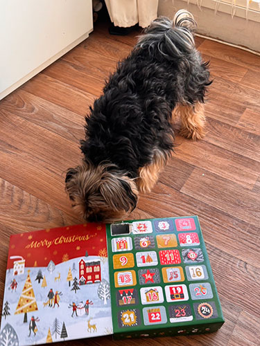 ▲今年はボクももらえた犬のおやつ入りアドベントカレンダー! いい匂いがするからクンクンが止まらない‥‥。