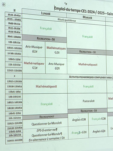 ▲フランスの小学校。 以前このコラムでも紹介したように、次の日の準備をするために 毎日確認するような日本の「時間割」的なものがありません。 これは年度はじめの保護者会で先生が説明してくれた画面を写メしたもの。 こういう経緯で時間割を知らなければ学校でどのような時間刻みで動いているのか 全くわからないフランスの学校。グレーの部分は休み時間。 どうやら休み時間は午前と午後1回ずつのようです。