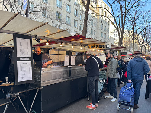 ▲クレープの日の日曜日。 マルシェに立つクレープ屋さんもず〜っと大行列のおおにぎわい。