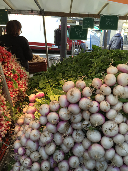 「ラディッシュ」=「かぶ」。 私にとって「かぶ」といえば 絵本の「おおきなかぶ」で登場する、 おじいちゃんもおばあちゃんも 孫もイヌもネコもみんなで 大きなかぶをひっぱる、あの「白いかぶ」。 なのですが、フランスで「かぶ」 プチトマトくらいの大きさの、 赤紫にちょっと白い部分がある 細長いタイプが、最もメジャーなもの。 とはいえそれ以外にも、 ![]() ▲こちらがちょっと大きめ。玉ねぎくらいの大きさの、日本でもいちばん見るタイプのかぶ。 プチトマトくらいの小さなサイズのかぶは、 とにかくポリポリカリカリ、 アペリティフのお酒のつまみなどに、 生のままいただくよ。 フランスの食卓には ものすごく頻繁に登場するラディッシュ。 ちょっぴり辛味もあって、 塩をつけて食べるだけで美味しいのです。 フランスではこのラディッシュに 十字の切り目を入れ、 そこにたっぷりバターを押し入れて、 美味しい塩を振っていただきます。 そう、このとき出てくる 意外すぎるアイテムが 「バター」です。 ![]() ▲前菜のおつまみに頻繁に登場するラディッシュ。 フランスではこんな風におおきなバターの塊と岩塩が一緒になって出てきます。 フランス人の家庭を訪れて アペロ(食前酒)のおつまみに 山盛りのラディッシュが出てくるときも、 レストランのおつまみで ラディッシュを頼んだときも、 おおきな塊バターとともに出てくるんだ。 まりこちゃんも最初は「?!?!」って ![]() ![]() ▲ラディッシュは十字に切り込みを入れ、そこにバターをたっぷり押し込んで塩をつけていただくのが定番。 ですが、お友達の家でおすすめされたのは、バターをたっぷり塗ったバゲットに縦半分に切ったラディッシュをのせて パラパラ岩塩をかけるという食べ方。これもとっても美味しかった♪ ちょっと辛みがあってさっぱりしたラディッシュと、 コクがあって濃厚なバターと、 そしてアクセントになる塩と。 3つの素材のハーモニー。 すぐにでも真似できるこのラディッシュバター、 ぜひみなさんにもやってみてほしい! 意外な組み合わせに 「えっ?!」って思うかもしれないけど、 「百聞は一見にしかず」ならぬ 「百聞は一食にしかず」?! ぜひやってみてね♪ とっておきのバターと塩を使ってね!