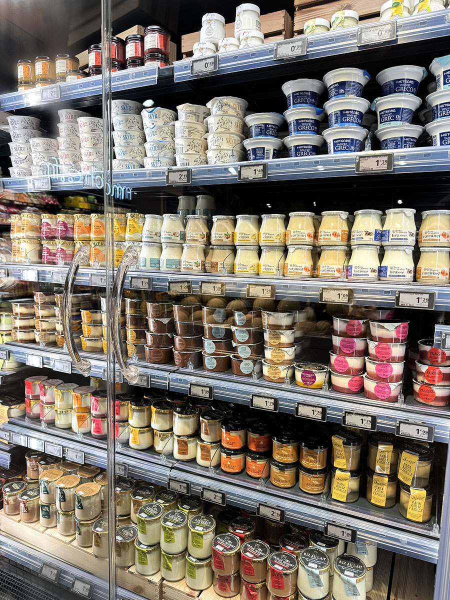 フランスのスーパーのヨーグルト売り場の ヨーグルト、ゼリー、杏仁豆腐、プリンetc. そしてヨーグルトの部分が濃厚で、