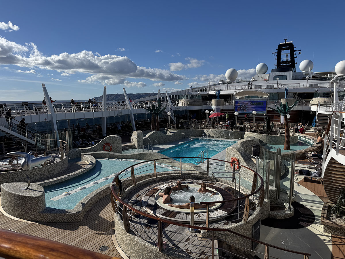 屋上デッキには屋外プールやウォータースライダー、 クルーズの旅は、