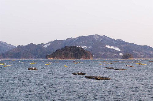 オランダ島と、山田湾の牡蠣の養殖筏。波はおだやか。