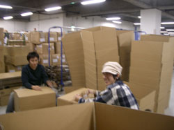 林立する段ボールのなかで青年達が作業中。