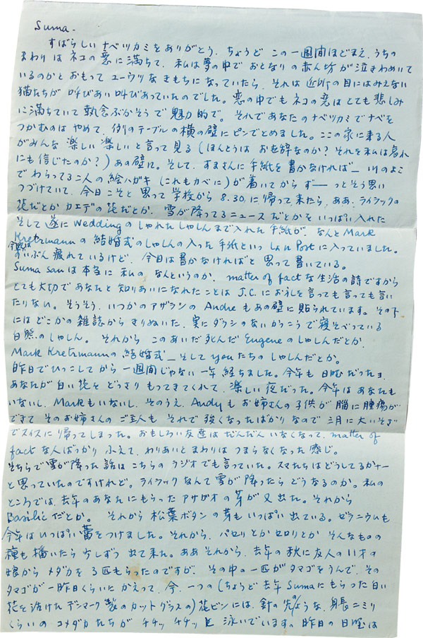 | 松家さん | そして、『つるとはな』創刊号には、 文芸系のニュースをひとつ掲載しています。 それは、エッセイストでイタリア文学者の 須賀敦子さんの未公開の手紙です。 心をゆるした「年下の友人」に宛てた手紙が 55通、見つかりました。 この一部を『つるとはな』の創刊号で独占公開いたします。 |