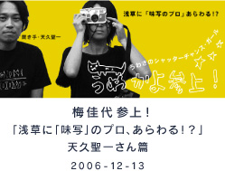 第5回 なんか、帰りたくなる。第4回 きもちの種類。第3回 韓流ドラマのせい。第2回 故郷。第1回 オ・ト・ナ。みんなの人気者・写真家の梅佳代さんが 「ほぼ日」に帰ってきてくれました! 『うめめ』『男子』『じいちゃんさま』『ウメップ』 という作品をつうじて ププッと吹き出しちゃうような、 ハッとするような、ジーンとするような写真を 見せてくれましたけど、 こんどはちょっと、雰囲気がちがうぞ‥‥? 新しい写真集は『のと』と言います。 梅佳代さんの、生まれ故郷の写真集です。 そのあたりの「新しい梅佳代‥‥なの?」について たっぷり、うかがってきました。 キーワードは「オトナ」「韓流」「コワい」です。 「ほぼ日」奥野が、おとどけします。