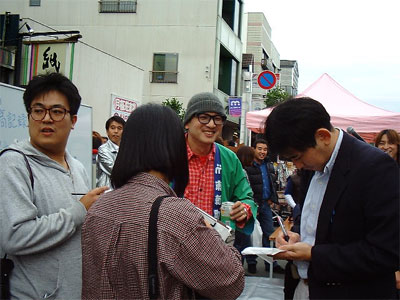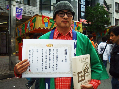 小脇に抱えるのが副賞「松坂牛3キロ」か。 |