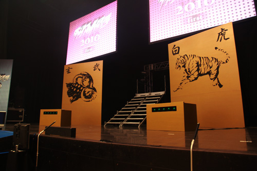 選手は玄武コーナーと白虎コーナーに別れて「笑い」を競う。 |