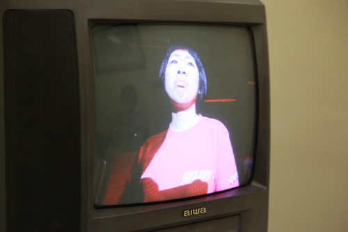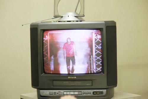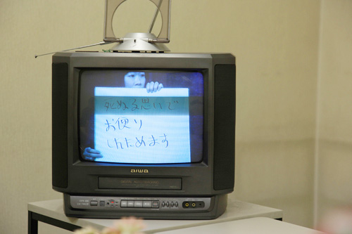 特別観覧ブースの江口先生。14型テレビデオのブラウン管で熱戦をモニター。 |
