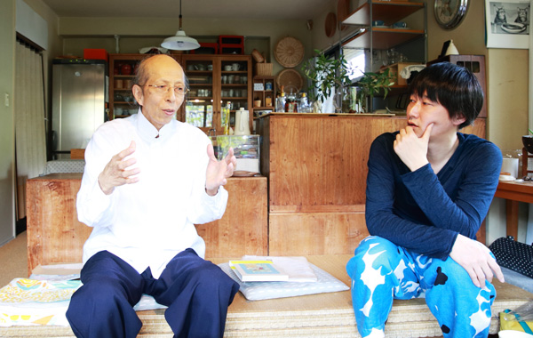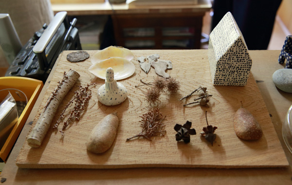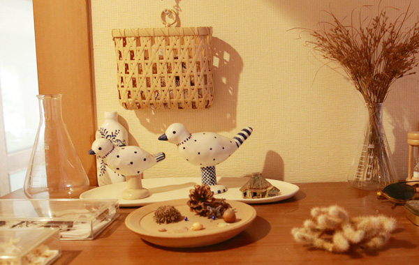 | 福田 | 脇阪さんの作品のイメージと、 お宅のインテリアが よく合っていらっしゃいますよね。 自然をよくモチーフによくされてるので、 そういう草花がたくさんある感じとか、 かわいいものが、そこかしこにおいてある感じ、 ベランダにはきっと春にたくさん お花も咲くんだろうなというようなところが。 けれども、脇阪さんの作品は、 あまり表に出されていないんですね。 |