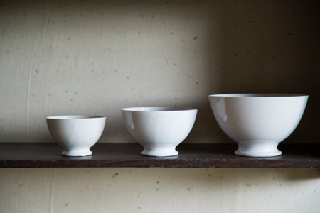| 岡田 | むかしのフランスのカフェオレボウルなどに とても好きなかたちのものがあるので、 すぐ見られるように並べています。 アンティークは好きですが、 日用雑器の古いものは、 じっさいに使うのをためらうほど よごれていることもありますよね。 ならばいま使えるものをと、 自分なりに、つくってみたりするんです。 その参考にしています。 |