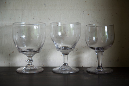 | 岡田 | 揺らぎみたいな感じ。 いまのものって、きれいすぎるじゃないですか。 なんていうのかな、ねっとりしたような感じが あるものが好きなんです。 これは全部イギリスのグラスなんですけど。 だいたい、150年とか200年ぐらい。 手が込んでいるのが、わかると、 そのことがまた、いとおしくて。 |