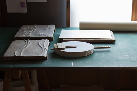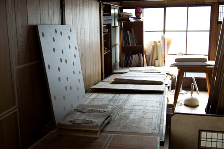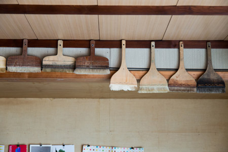 | 嘉戸 | 唐紙の工房では特に自分用の道具が 決まってる訳ではないんです。 普通、たいがい職人さんて、これ、自分の刷毛とか、 決まってると思うんですよ。 だからその人の手に合った 道具になってるはずなんですけど、 唐紙の場合は特別自分専用の道具がない。 だから自分で始めようと思うと全部新調するんです。 ぼくの場合、まだ使い込まれてないから、 ますます色気がない。 こうして工房をお見せするのに、 みなさんの期待はずれになっちゃうんで恥ずかしい(笑)。 それにこの広さだと、襖でいえば一気にできるのが、 4枚分ぐらいなんです。 広い工房があればもっと沢山一気に作れるのですが‥‥。 |