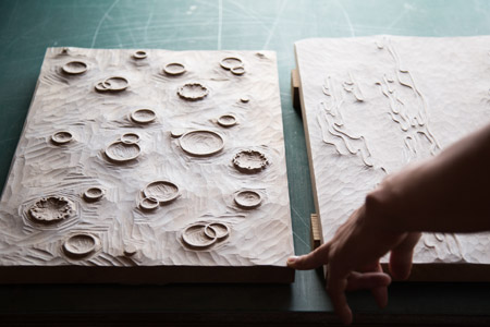 | 嘉戸 | 紙に、縦の寸法なら30センチずつ、 見当を付けるんですね。 で、作業台には版木の横幅の見当を付けるんです。 したら1回、絵具をここにのせて、1枚刷る。 そして、版木を45センチずらして、また刷る。 1列刷ったら、こんどは紙を30センチずらして、 2列目を刷る。そういうふうにやっていきます。 つまり、手動のインクジェットプリンタのようなものです。 よく、このちっちゃい版木で どうやってあんなおっきいの作るのって 言われるんですけど、 そういうふうにつくっているんですよ。 |