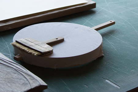 | 嘉戸 | 刷毛に絵具をつけて、 まず、こちらの木の道具の 全面に塗るんですね。 それを、版木に移すんです。 |