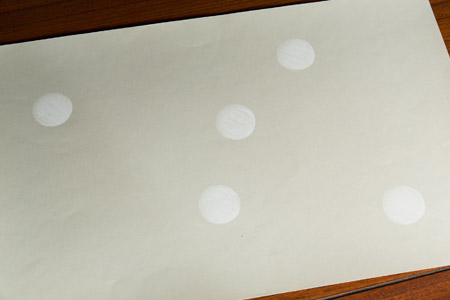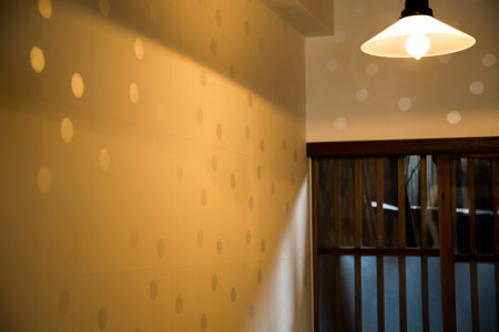 | 嘉戸 | それは、妻のアイデアなんです。 最初に仕事やるときに、ぼくらには版木がない。 版木がなければつくれないんですね。 で、彼女の中で、水玉とボーダーは永遠のモチーフで、 それだったら自分でもできる。 まず、できるものからやろうと、 いちばん最初につくったのがこれなんです。 で、最初に張ってあると、面積もおっきいんで、 イメージがついたんです。 かみ添イコールこの壁って。 それで結構いろんなところで紹介してもらって、 これがいちばん売れたりするんですけど。 ただ、単純に水玉だけでは面白くないので、 不規則に見えるよう丸を配置しました。 線上に並べないとか、1個、敢えて仲間外れつくって、 むりやり余白を大きく取るとか、 180度回転させたら余白のところに また水玉がきれいにすっぽり入るようになるとか。 古典の文様でそういう意匠があるのを、 グラフィックデザインの経験とかけ合わせてる感じです。 そういうの考えるときは ちょっとグラフィックの頭になります。 しかし白で行くのはある意味むずかしいですね。 どんどん足していくのってできるんですけど、 白でとどめとくのってなかなか難しくて。 みんな、やっぱり色の強いものを求めはるし、 刺激が強いものに慣れてると、 やっぱ白ではものたりなかったりするんですけど、 こういうものってやっぱり素材の色とか、 もとにある白い色のよさっていうのは伝わると思うんで、 ぼくはその点でやっぱり白いものをたくさんつくろうと 考えているんです。 |