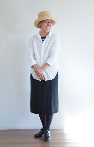 | 岡戸 | そんなわけだから、たぶん白いシャツは、 黒と紺のスカートに合わせやすいように 多くなっていったのかもしれません。 そんなこと、今日初めて、気が付いたんですけど。 |
