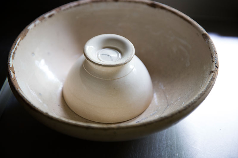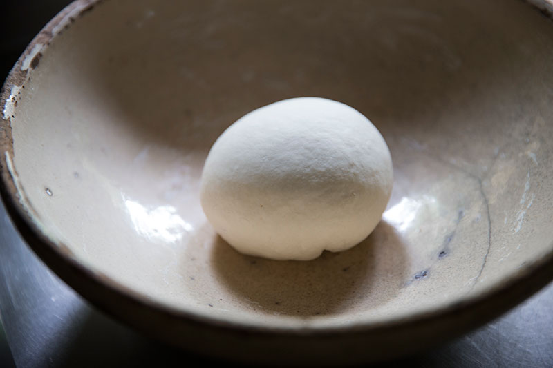 手打ちパスタは、打ち終わったらまるめて 20〜30分ほど寝かせておくのですが、 乾かないようにこうして ボウルを逆さにしてかぶせます。 ラップだと、くっついてしまうので。 (細川)