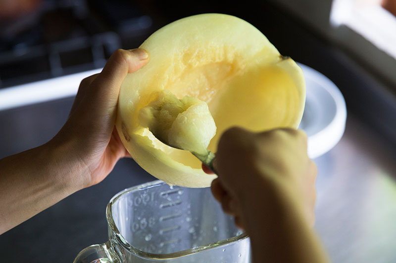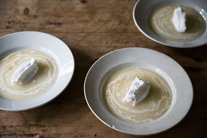 デザートは白いものを。 卵白にバニラシュガーを入れて メレンゲ状に泡立てたものを、 メロンをくりぬいてミキサーにかけた つめたいスープにのせて、 ホワイトチョコレートと生クリームを 湯せんで溶かしたものをかけました。 このデザートは湯せん以外は火を使いません。 卵白も、ウフ・ア・ラ・ネージュ (メレンゲを茹でる)とちがって、生。 けれどもバニラシュガーの効果で、 卵臭さがまったくないのです。 このメロンのスープのような白が、 とても好きです。 (細川)