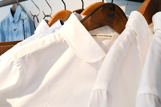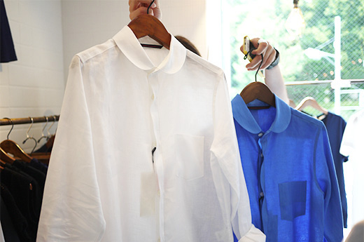 ▲定番の丸襟シャツ。今回販売するものは、襟にステッチがないので、より「きちんと感」が強い印象になっていますよ。