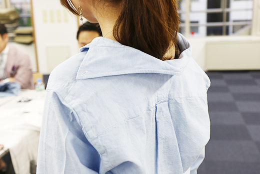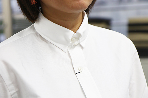 ▲ゆーないとが着させてもらった、フィット系のレディスシャツ。衿と身頃が一枚仕立てになっているので、曲線がとてもきれい。