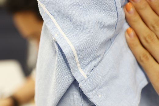 ▲これは、袖の内側に出た「セルビッチ(生地のミミ)」部分。古い織機で織った布にはこれが出ます。こういうものも、シャツのかっこよさのひとつ。