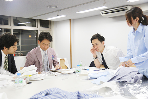 ▲HITOYOSHIシャツの松岡さんが持ってきてくれたサンプルを前に、みんなで検討しました。